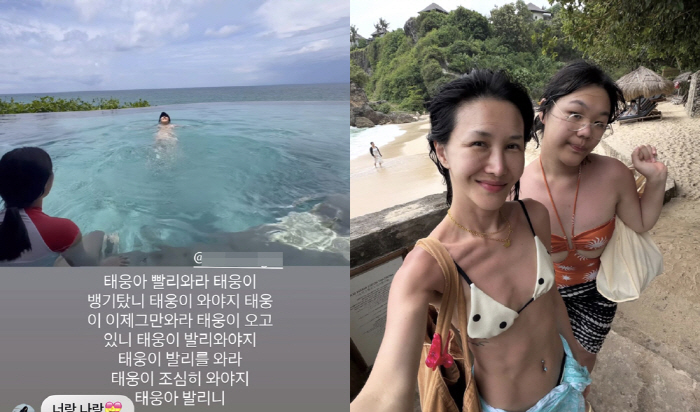 윤혜진은 지난 15일 개인 계정에 "태웅아 빨리 와라. 태웅이 비행기 탔니? 태웅이 와야지. 이제 그만 와라. 태웅이 오고 있니? 태웅이 발리 와야지. 조심히 와라. 태웅아 발리니"라는 글과 함께 물놀이를 즐기는 영상을 게재했다.