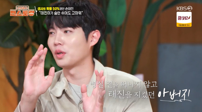 손태진은 "인큐베이터에 2주 내내 있는 동안 그 곁을 아버지가 떠나지 않고 멀리서 지켜봤다더라. 그만큼 저를 귀하게 키워주셨다"고 밝혔다.