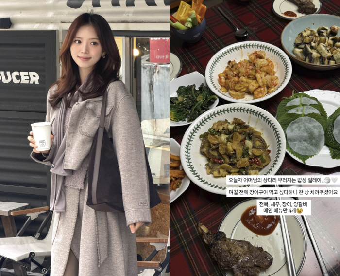 이어 김지영은 "전복, 새우, 장어, 양갈비 메인 메뉴만 4개"라면서 "깻잎, 무쌈, 스리라차 소스 필승 조합 꿀꺽"이라면서 시어머니 표 밥상을 자랑하며 행복한 미소를 지어 눈길을 끌었다.