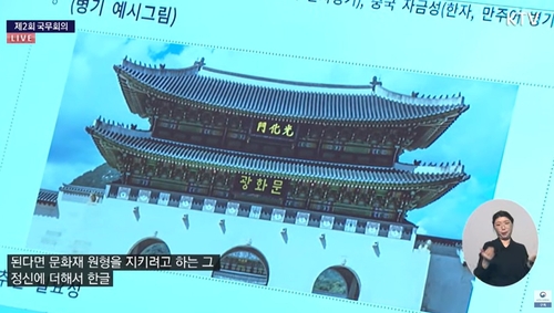 최 장관은 '외국에서도 현판을 병기하는 사례가 있냐'는 이 대통령의 질문에 "중국 자금성도 만주어와 한자 현판이 있는데, 역사적 유연성을 보여준다"며 "세계적으로 우수성을 인정받는 한글을 보유한 나라에 한자(현판)만 있다는 것은 적절치 않다"고 답했다.