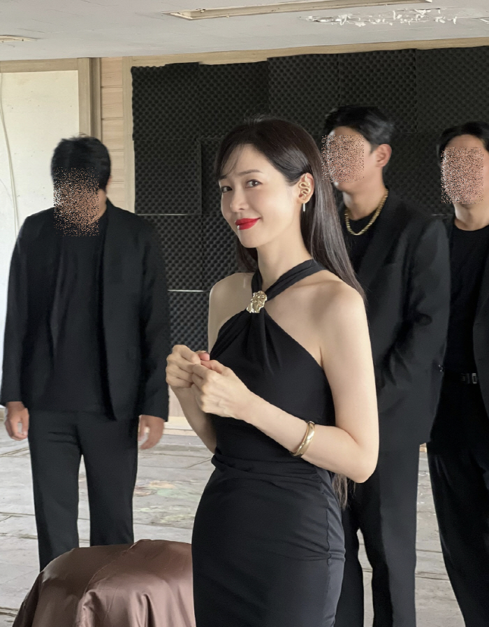 한쪽 다리 트임이 포인트인 블랙 홀터넥 드레스를 입은 성유리는 강렬한 레드립으로 시선을 사로잡았다.