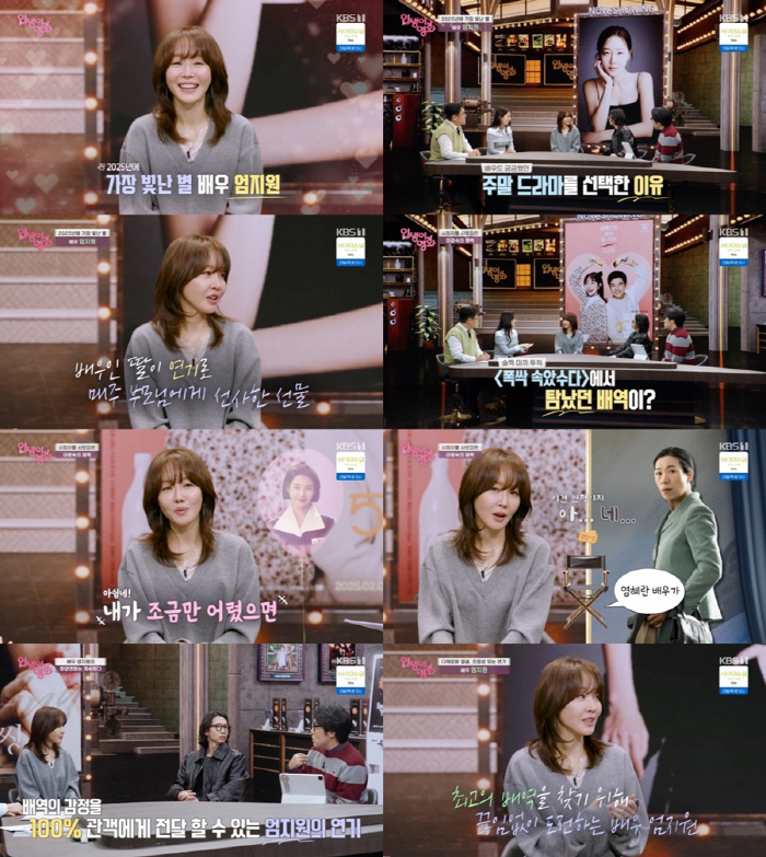 24일 밤 방송된 KBS 1TV '인생이 영화'에서는 연기대상 수상 이후에도 다가올 최고의 캐릭터를 기다리고 준비하는 배우 엄지원의 현재진행형 필모그래피가 그려졌다.