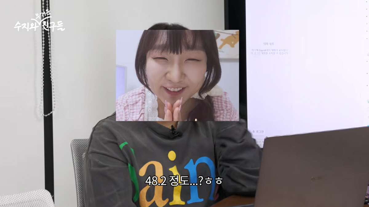 제작진이 이수지의 몸무게를 묻자 그는 "48kg이다. 요즘엔 좀 쪄서 48.2kg"라고 능청스럽게 답하며 자신의 부캐 '에겐녀 뚜지'를 소환해 현장을 폭소케 했다.