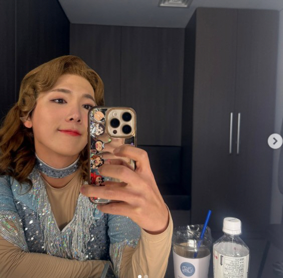 공개된 사진 속 이홍기는 웨이브 헤어와 섬세한 메이크업, 반짝이는 무대 의상을 갖춘 여장 모습으로 거울 셀카를 남기고 있다.