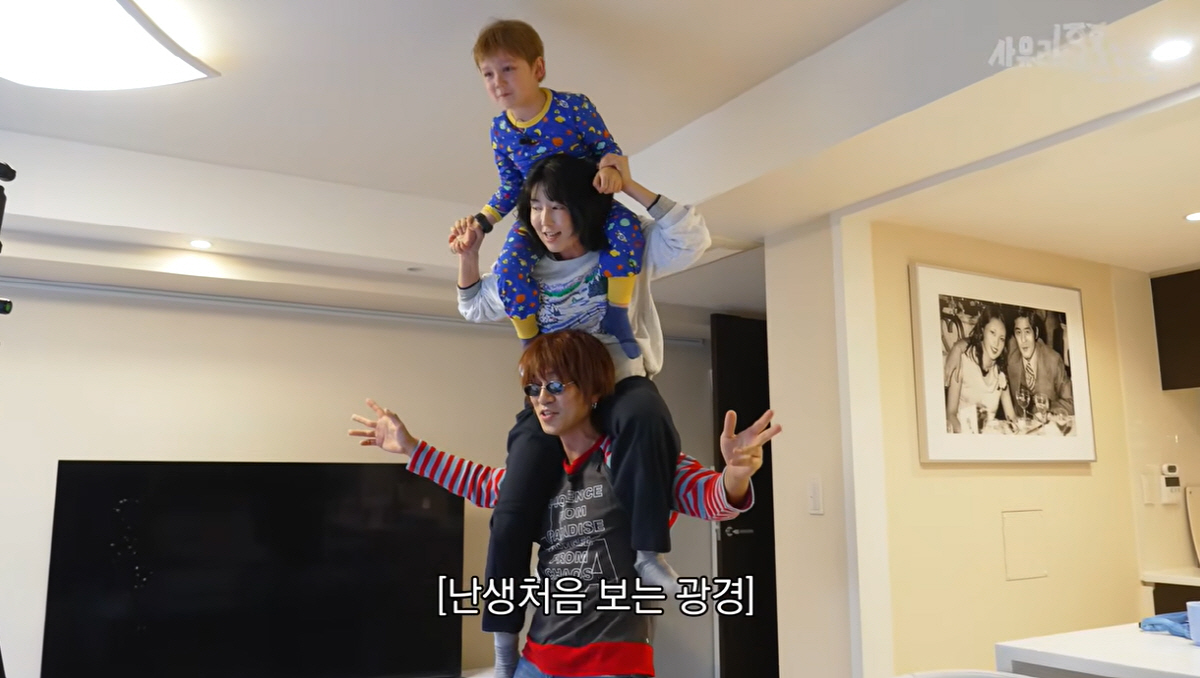 먼저 사유리부터 가뿐하게 목마를 태운 후 김경욱은 "젠도 엄마 위에 올라가라. 세 명이 되는 거다"라고 말했고, 젠은 사유리의 어깨 위로 올라타며 합류했다.