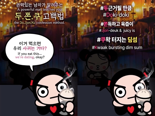 ## '가루'가 턱을 괴고 딤섬이 담긴 잔을 건넨다. 그 위로 "두쫀쿠 고백법. '두'근거릴 만큼 '쫀'득하고 육즙이 '쿠'왁 터지는 딤섬"이라는 설명이 나타난다. 배경으로는 감미로운 팝송이 깔린다.