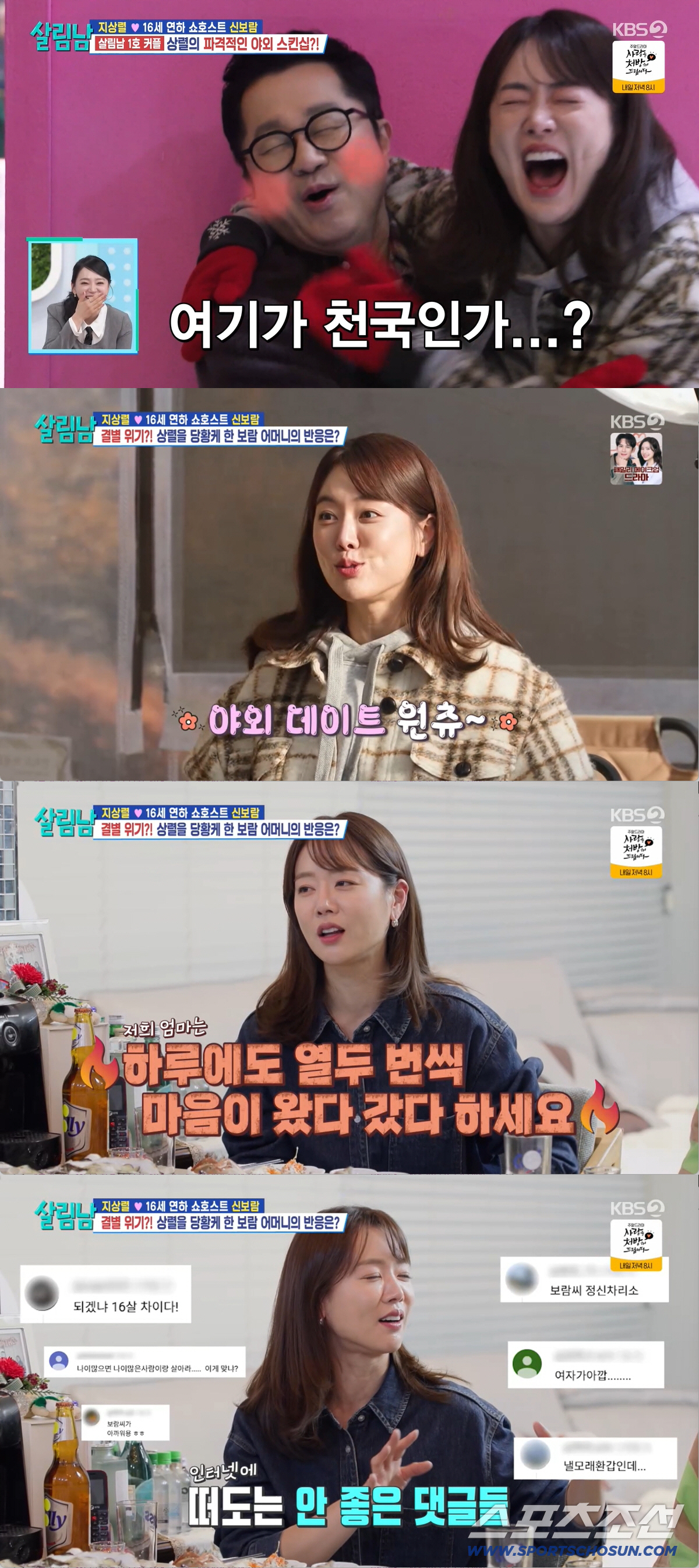지상렬은 신보람의 주변 반응에 대해서도 조심스럽게 물었다. 신보람은 "기사 보고 엄마가 엄청 속상해하시기도 했다. 가짜 뉴스나 별 얘기들이 나와 걱정을 하셨다"면서도 "우리가 만나는 것 자체는 응원하고 좋아하신다. 재밌어하신다"고 전해 지상렬을 안심하게 만들었다. 또한 16세의 나이 차이에 대한 부담을 걱정하는 지상렬에게 "우리 나이 비슷해"라고 밝게 받아치며 훈훈한 분위기를 자아냈다.