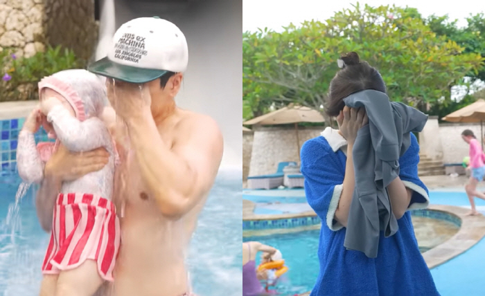 영상 속 장수원 부부는 두 살 된 딸과 함께 수영장을 찾았고, 아빠 장수원은 딸을 안고 워터 슬라이드를 탑승했다. 그러나 딸을 꽉 잡고 있던 장수원은 내려오는 과정에서 생각보다 따른 속도와 다리가 물속에서 닿지 않아 딸과 함께 물에 빠지고 말았다. 이에 놀란 딸은 눈물을 터트렸고, 장수원은 "미안하다"면서 딸을 달래며 진정시켰다. 다행히 아빠 품에서 빠르게 진정된 딸.