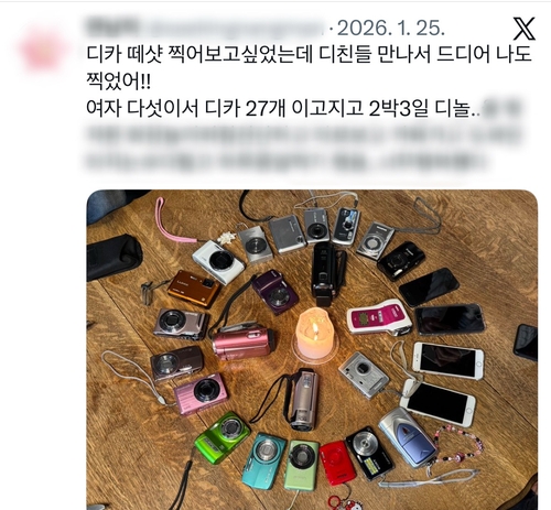 엑스 이용자 'se***'는 "디카 떼샷 찍어보고 싶었는데 디친들 만나서 드디어 나도 찍었다. 여자 다섯이서 디카 27개 이고지고 2박3일 디놀했다"는 글을 올렸다.