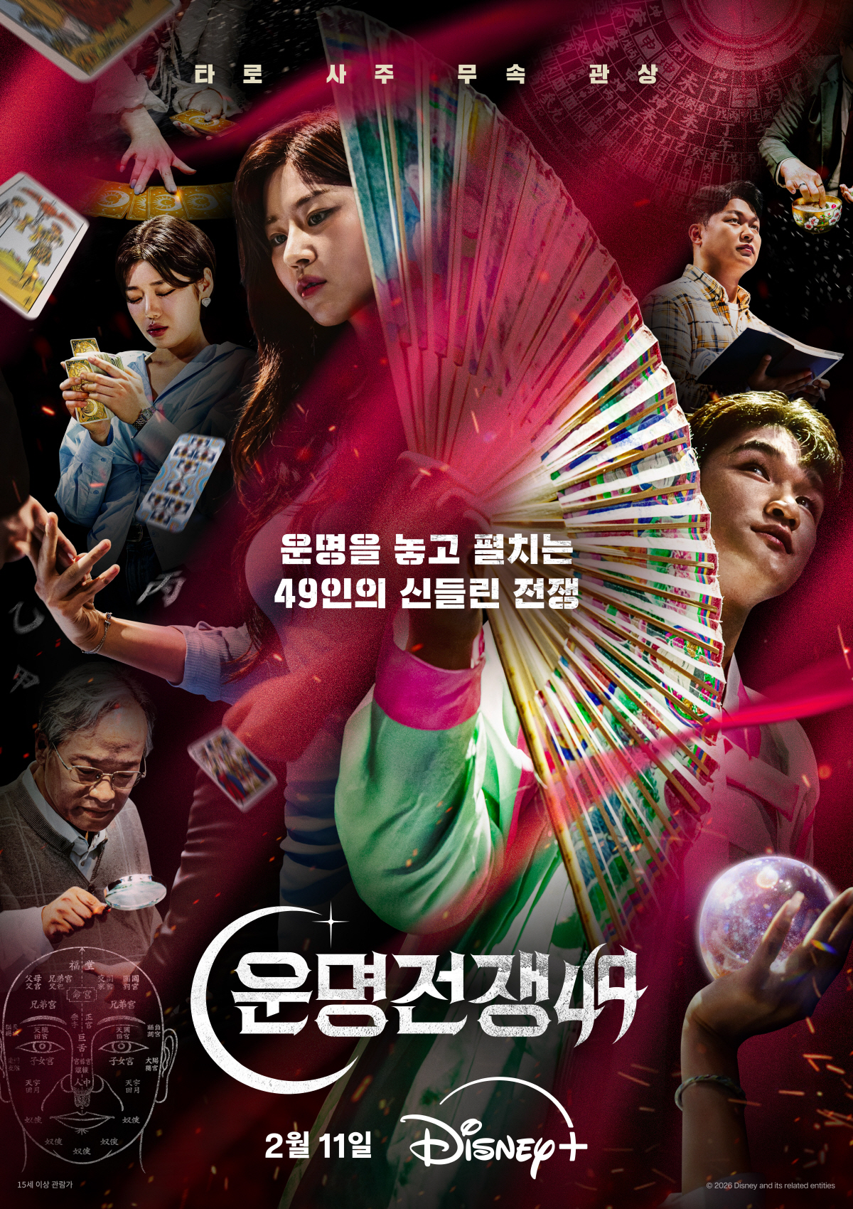 디즈니+가 공개한 '운명전쟁49'의 '전쟁' 포스터에는 타로, 사주, 무속, 관상 등 각 분야에서 이름을 알린 49인의 운명술사들이 총출동해, 저마다의 방식으로 운명을 해석하는 모습이 담겨 시선을 사로잡는다. 타로 카드와 쌀, 돋보기와 부채, 수정구슬 등 각자의 업을 상징하는 다채로운 오브제들은 명예와 자존심을 짊어진 운명술사들의 각오를 보여주며 거대한 전쟁의 시작을 예고한다.