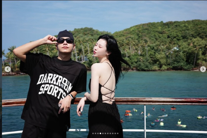 에메랄드빛 바다를 배경으로 요트 위에 선 두 사람의 모습이 눈길을 끈다. 사이먼 도미닉은 블랙 비니와 선글라스, 오버핏 티셔츠로 특유의 힙한 분위기를 드러냈다. 한 손으로 선글라스를 살짝 들어 올린 채 여유로운 표정을 짓는 모습이 인상적이다.