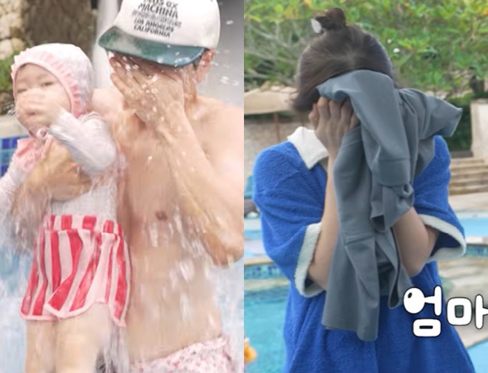 하지만 예상치 못한 변수가 생겼다. 짧은 슬라이드의 속도가 생각보다 빨랐던 것. 장수원은 중심을 잃고 딸과 함께 물에 빠졌고, 놀란 아이는 울음을 터뜨렸다. 이를 본 아내는 "자기야! 뭐하는 거냐"라고 외치며 놀란 마음을 드러냈다.