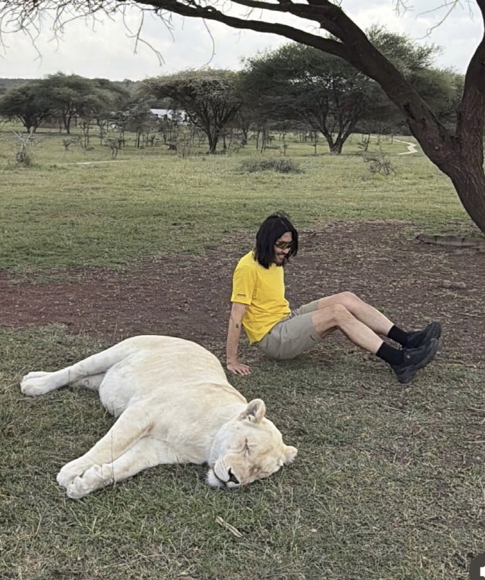 앞서 지난달 30일 그는 탄자니아 여행 중 "잠자는 사자의 털끝을 건드려본다"라는 문구와 함께 백사자의 배를 만지거나 사자 옆에 누워 미소 짓는 모습, 나란히 걷는 장면 등을 올렸다. 사람이 만져도 크게 반응하지 않는 사자의 모습에 일부 누리꾼들은 "AI 합성 아니냐"는 반응을 보였다.