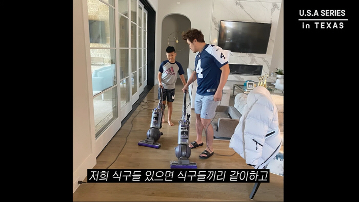 하원미는 "여기가 저번 영상에서 보시면 야구 박물관이라고 되어있지 않냐. 벽을 둘러서 남편의 아카이브로 다 갖춰져 있는데 그거 뿐 아니라 여러 용도로 사용할 수 있게 농구 하프 코트도 있고 아이들이 다 야구를 해서 야구 배팅 연습도 실내에서 할 수 있게 했다. 그리고 애들 웨이트 해야 해서 웨이트장도 따로 있다"며 "어떻게 보면 아이들과 아빠가 가장 많이 사용하는 공간이다. 자기들이 썼으면 자기들이 청소해야지. 되게 공간이 큰데 쉬엄쉬엄 해보려고 한다. 걱정하시는 것만큼 청소가 힘들지는 않다"고 청소에 나섰다.