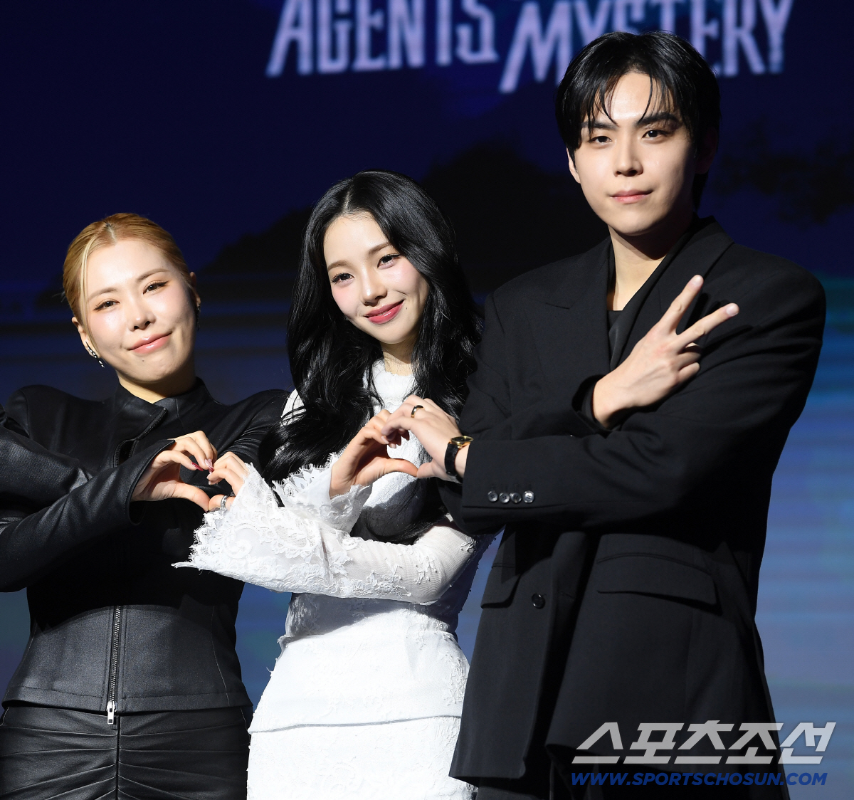넷플릭스 예능 '미스터리 수사단' 시즌2 제작발표회가 19일 오전 서울 마포구 호텔 날 서울엠갤러리에서 열렸다. 가비, 카리나, 김도훈이 포즈 취하고 있다.