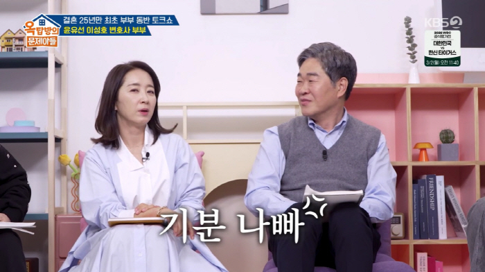 19일 방송된 KBS2 옥탑방의 문제아들에는 배우 윤유선과 부장 판사 출신 이성호 부부가 출연했다.