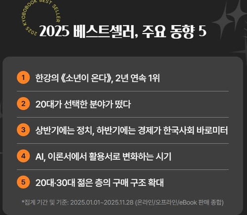지난해 상반기에는 6월3일 대통령 선거로 인해 정치·사회 분야 도서가, 하반기에는 코스피가 1980년 출범 이후 처음으로 4,000선을 돌파한 영향으로 주식 등 경제·재테크 도서가 각각 주목받았다. 2024년 한강의 노벨문학상 수상 여파가 이어지면서 한국문학은 지난 한 해 꾸준히 독자들의 선택을 받았다.