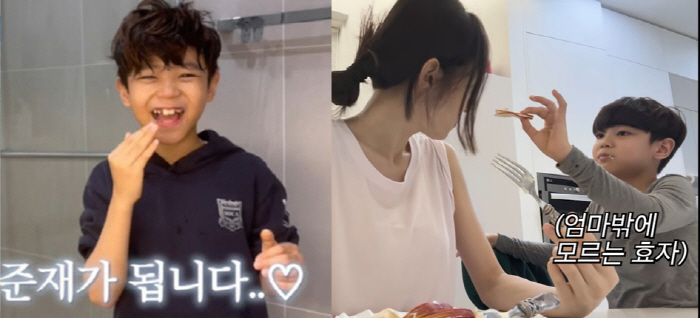 이후 준재 군은 엄마 옆에 꼭 붙어 입을 크게 벌린 채 사과 먹방 중인 귀여움 가득한 모습도 선보여 웃음을 자아냈다.