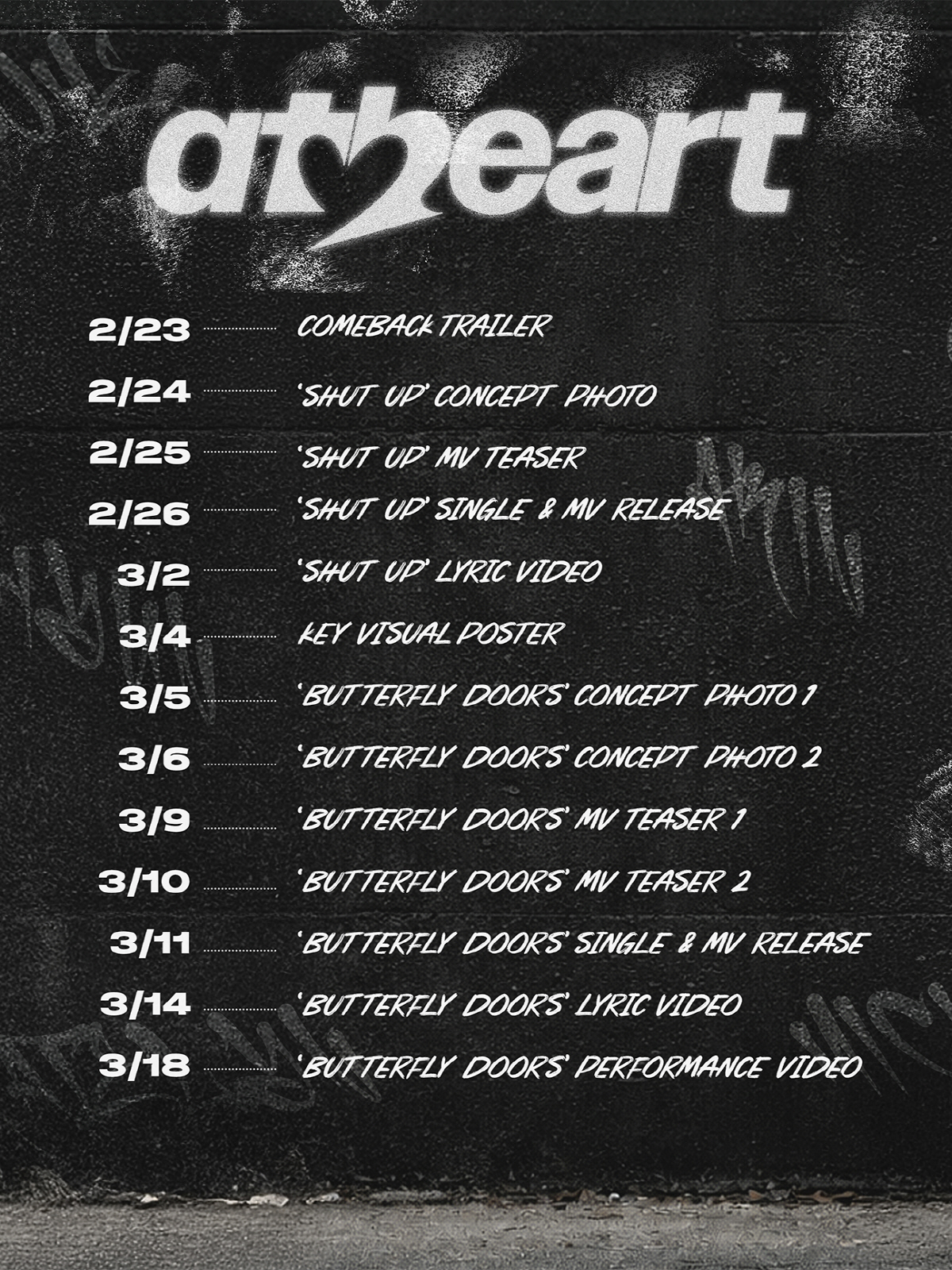 앳하트는 지난 22일 공식 SNS를 통해 컴백 스케줄러를 게재했다. 이에 따르면, 앳하트는 오는 2월 26일 오후 6시 디지털 싱글 'Shut Up'을, 3월 11일 오후 6시 또 다른 디지털 싱글 'Butterfly Doors'를 잇달아 발매하며 컴백 열기를 이어간다.
