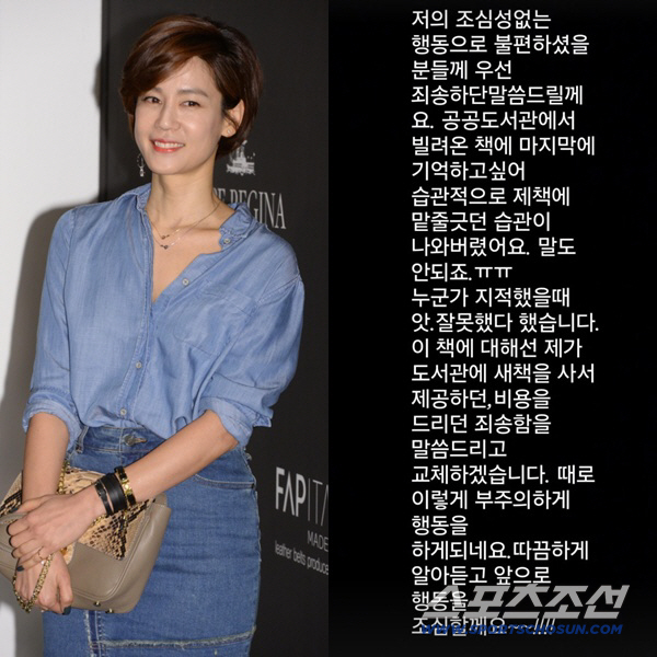 [스포츠조선 이우주 기자] 배우 김지호가 공공 도서에 밑줄을 긋는 실수를 했다가 사과했다.