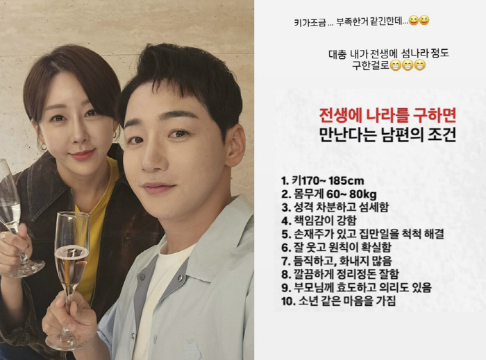 이를 본 한영은 남편 박군을 떠올리며 10가지 조건을 확인, 그는 "키가 조금 부족한 거 같긴 한데 대충 내가 전생에 섬나라 정도 구한 걸로"라면서 남편을 향한 애정을 드러내 시선을 끌었다.