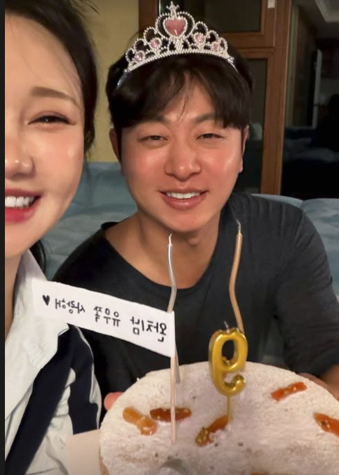공개한 사진에는 케이크를 들고 왕관을 쓴 유상무의 모습이 담겼다. 케이크에는 '완치남 유무쪽'이라는 글과 함께 숫자 '9' 초가 꽂혀있다.