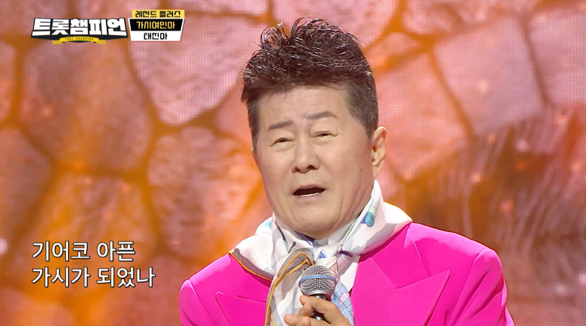 태진아는 26일 방송된 MBC ON '트롯챔피언'에 출연해 신곡 '가시여인아' 무대를 선사했다. 두 팔을 벌리는 동작으로 '가시여인아'의 분위기를 잡아간 태진아는 호소력 짙은 목소리로 '가시여인아'에 몰입한 채 떠나간 여인에 대한 그리움을 토로했다. 이에 무대가 끝난 뒤에도 '가시여인아'가 입가에 계속 남는 깊은 여운을 선사했다.
