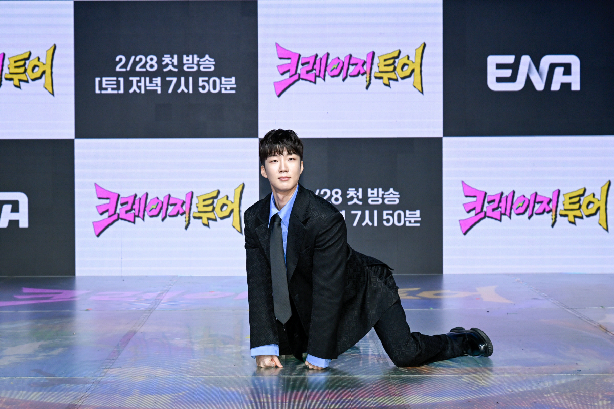 이승훈은 27일 서울 마포구 상암동 쇼킹케이팝센터에서 열린 ENA '크레이지 투어' 제작발표회에서 "저는 프로그램 안에서 '꼰대 사냥꾼'이었다"며 "형님들 중 가장 꼰대는 비 형님"이라고 했다.