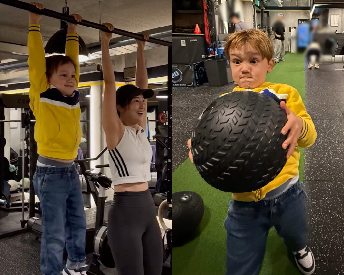 이때 엄마를 따라 다양한 동작을 선보이고 있는 젠 군이 눈길을 끈다. 철봉에 매달려 엄마와 나란히 버티기에 도전하는가 하면, 케틀벨을 두 손으로 잡고 흔드는 동작까지 똑같이 따라 하고 있는 젠군. 작은 체구에도 제법 진지한 표정으로 동작을 소화하는 모습이 사랑스러움을 더했다.