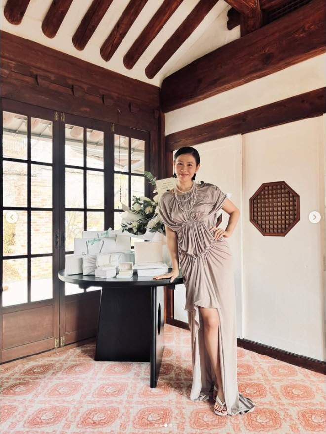 공개된 사진 속 손예진은 차분한 베이지 톤의 드레스를 입고 한옥 분위기의 공간에서 포즈를 취하고 있다. 자연광이 들어오는 창가에 기대 선 그는 우아한 실루엣과 단아한 분위기로 시선을 사로잡았다. 특히 몸선을 따라 흐르는 드레이프 디테일의 드레스가 손예진 특유의 고급스러운 분위기를 한층 강조했다.