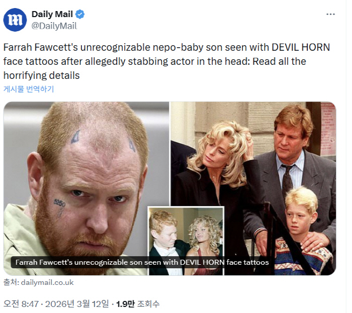[스포츠조선 박아람 기자] 배우 고(故) 파라 포셋(62)과 배우 고(故) 라이언 오닐(82)의 아들 레드몬드 오닐(41)이 법정에 출석한 모습이 포착됐다. 당시 그는 이마에 악마 뿔 모양 문신을 새긴 모습이었다.