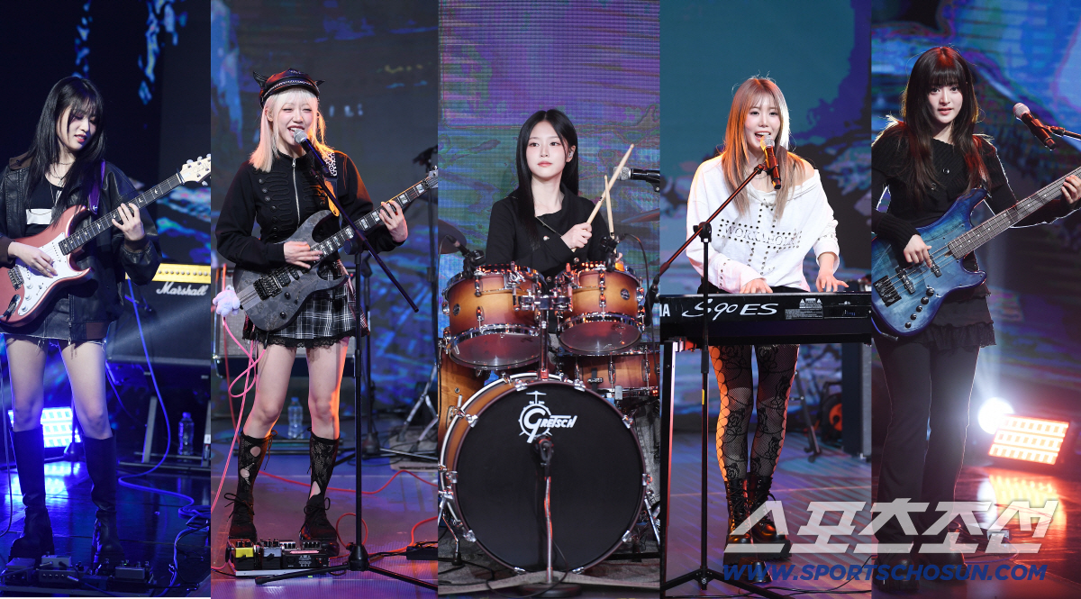 18일 오후 서울 상암동 쇼킹케이팝센터에서 밴드 '레이턴시'의 첫 번째 미니앨범 발매 쇼케이스가 열렸다. 희연(기타), 지원(기타), 현진(드럼), 하은(건반), 세미(베이스)가 멋진 연주를 선보이고 있다. 정재근 기자 cjg@sportschosun.com/2026.3.18/