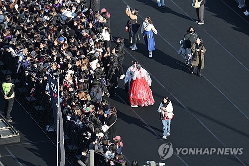 한복을 입은 외국인 관객도 공연장 안팎에서 포착됐다. 스마트폰으로 현장의 열기를 담는 팬들의 얼굴에는 연신 미소가 번졌다. 공연장 바깥의 일부 팬은 감동한 듯 눈물을 연신 닦기도 했다.