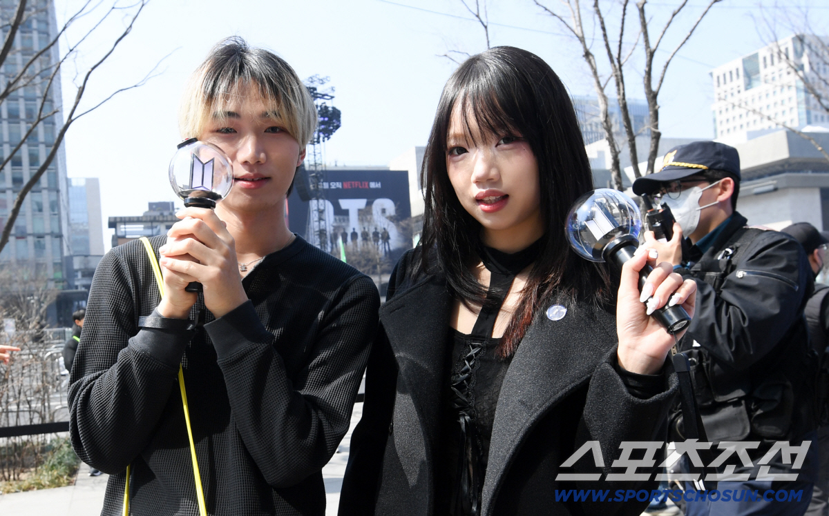 그룹 방탄소년단(BTS)이 21일 서울 광화문 광장에서 정규 5집 '아리랑'(ARIRANG) 발매를 기념 'BTS 컴백 라이브: ARIRANG'(BTS THE COMEBACK LIVE|ARIRANG)를 진행했다. 아미(BTS 팬덤)가 포즈를 취하고 있다. 광화문=박재만 기자 pjm@sportschosun.com/2026.03.21/