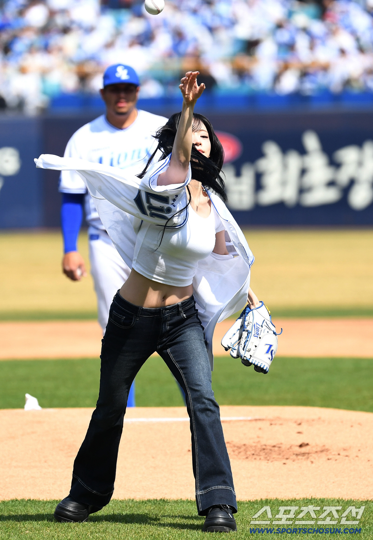 28일 대구 삼성라이온즈파크에서 열리는 삼성과 롯데의 개막전 경기. 기념 시구를 하고 있는 걸그룹 '프로미스나인' 이채영. 대구=송정헌 기자songs@sportschosun.com/2026.03.28/