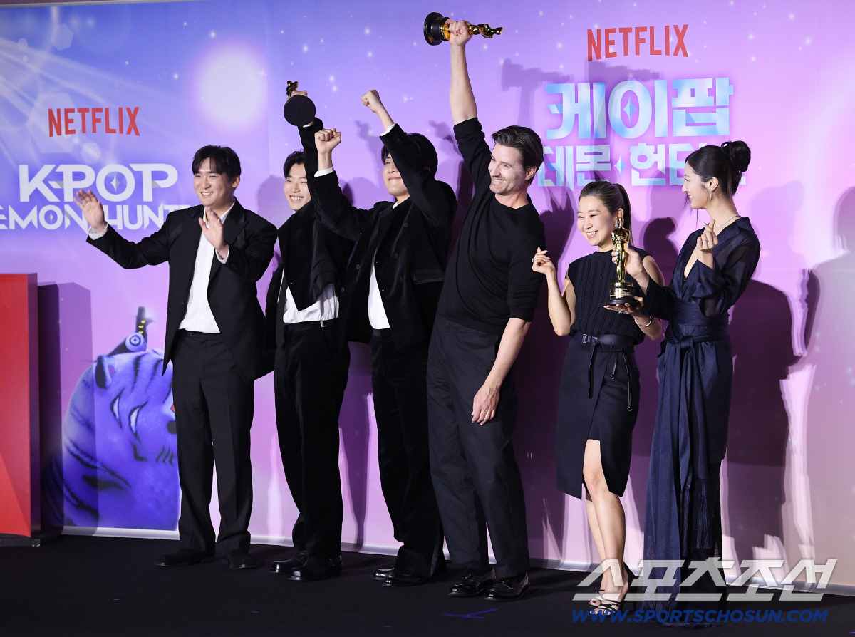 넷플릭스 '케이팝 데몬 헌터스' 아카데미 수상 기념 기자간담회가 1일 오후 서울 CGV용산에서 열렸다. 남희동, 이유한, 곽중규, 크리스 애플한스, 매기강 감독, 이재가 함께 포즈 취하고 있다. 정재근 기자 cjg@sportschosun.com/2026.4.1/
