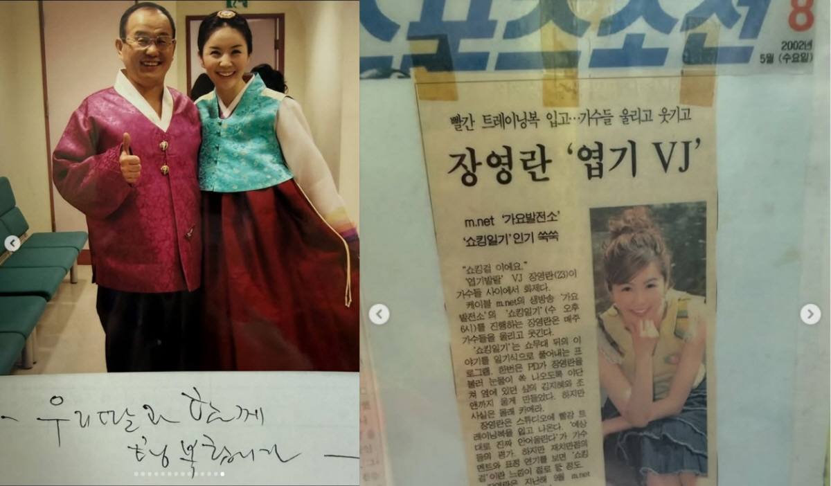공개된 사진에는 한복을 차려입은 장영란과 아버지의 다정한 투샷이 담겼다. 밝은 미소로 나란히 서 있는 모습은 생전의 따뜻했던 부녀 관계를 짐작하게 한다. 또 다른 사진에는 장영란의 과거 활동이 담긴 신문 스크랩이 고스란히 보관된 모습이 담겨 눈길을 끌었다. '엽기 VJ' 시절 기사가 실린 오래된 신문과 스포츠지 기사 등이 정성스럽게 보관돼 있어 아버지가 딸의 활동을 얼마나 자랑스러워했는지가 엿보인다.