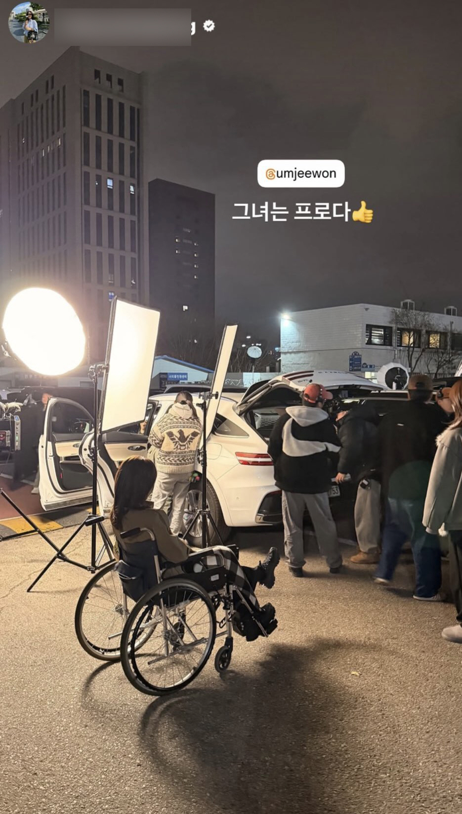 또 다른 사진에서는 휠체어에 앉아 촬영에 임하는 모습도 공개됐다.