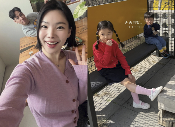사진 속에는 딸 리은 양과 아들 남주 군과 함께 외출에 나선 주말 모습이 담겨있다. 나란히 앉아 귀여운 비주얼을 자랑 중인 남매의 모습이 시선을 끄는 가운데, 특히 남주 군은 입에 손을 넣은 채 해맑은 표정을 짓고 있어 웃음을 자아냈다