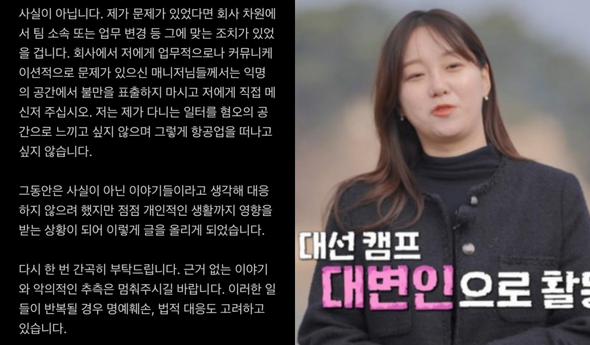 그는 과거 항공사 근무 시절을 언급하며 직장 내 괴롭힘과 근거 없는 소문으로 큰 어려움을 겪었다고 밝혔다. "선배 대우를 하지 않는다거나 남자 사무장과의 염문설 등 사실이 아닌 이야기들이 퍼졌다"며 당시 상황을 설명했다. 관련 자료와 증거 역시 보관 중이라고 강조했다.