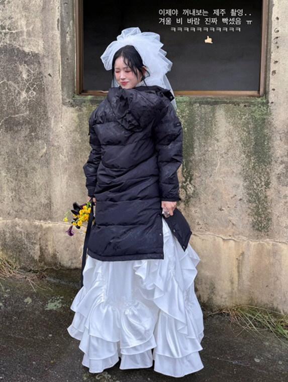 공개된 사진 속 최준희는 면사포와 드레스를 착용한 채 웨딩 촬영에 임하고 있는 모습이다. 비와 강한 바람이 부는 궂은 날씨 속에서도 촬영을 이어가는 모습이 눈길을 끈다. 특히 쉬는 시간에는 패딩을 입고 몸을 녹이며 추위를 견디는 모습으로 시선을 모았다.