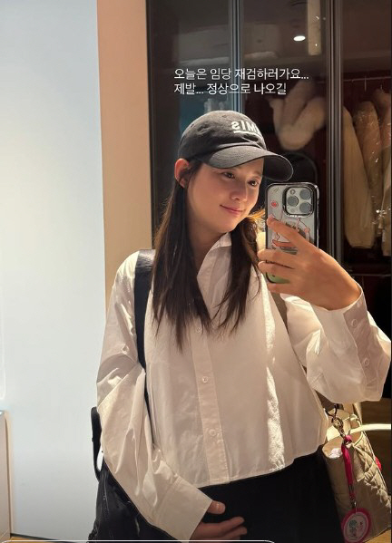 사진에서 남보라는 흰 셔츠에 검은 하의를 매치한 편안한 차림에 검은 볼캡을 눌러쓴 모습. 한쪽 어깨에는 가방을 멘 채 자연스럽게 배에 손을 얹었다. 선명하게 드러난 D라인이 시선을 끈다. 검사 전 긴장감 속에서도 차분한 분위기가 묻어난다.