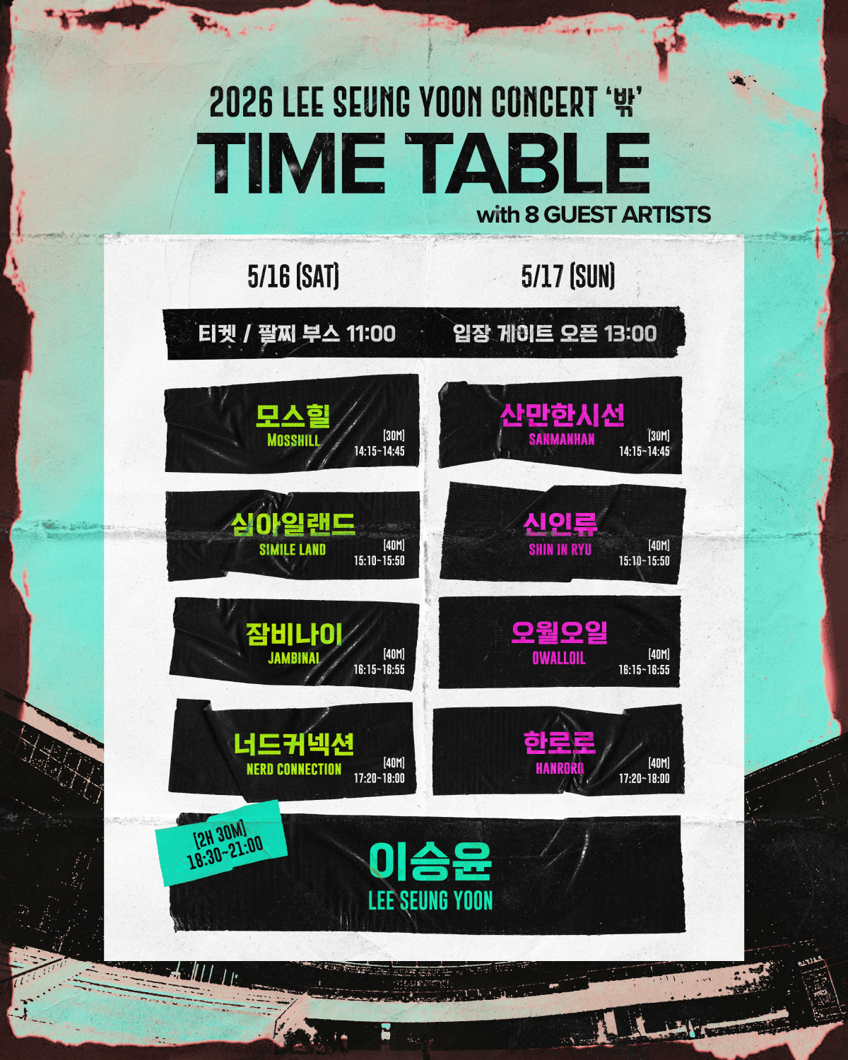 이승윤은 지난 13일 공식 SNS를 통해 오는 5월 16~17일 경기 고양 킨텍스 밖(제2전시장 후면광장)에서 개최되는 '2026 이승윤 콘서트 '밖''(이하 '밖')의 최종 게스트와 타임테이블을 공개했다.