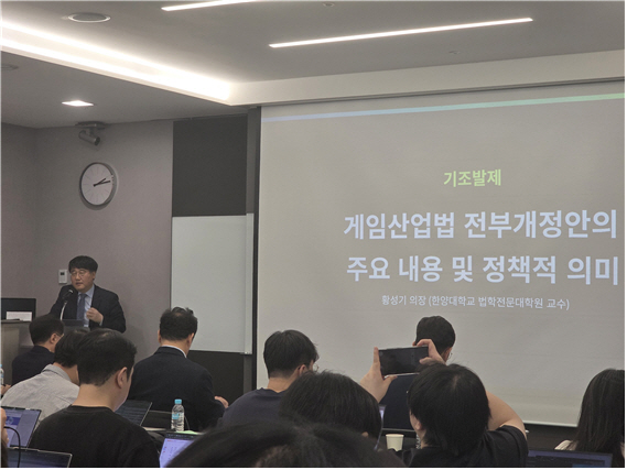 기조발제 나선 황성기 한국게임정책자율기구 의장은 이번 전부개정안이 2006년 게임산업법 제정 이후 지난 20년간 유지되어 온 낡은 규제 중심의 체제를 탈피했다는 점을 강조했다. 특히 기존 규제 중심의 체계에서 벗어나 게임을 문화 및 산업으로 확장하고 진흥 중심의 정책 전환을 시도한 점에서 의미가 크다고 평가하면서, 다만 입법자의 의지가 제대로 반영될 수 있는 세부적인 시행이 필요하다고 설명했다.