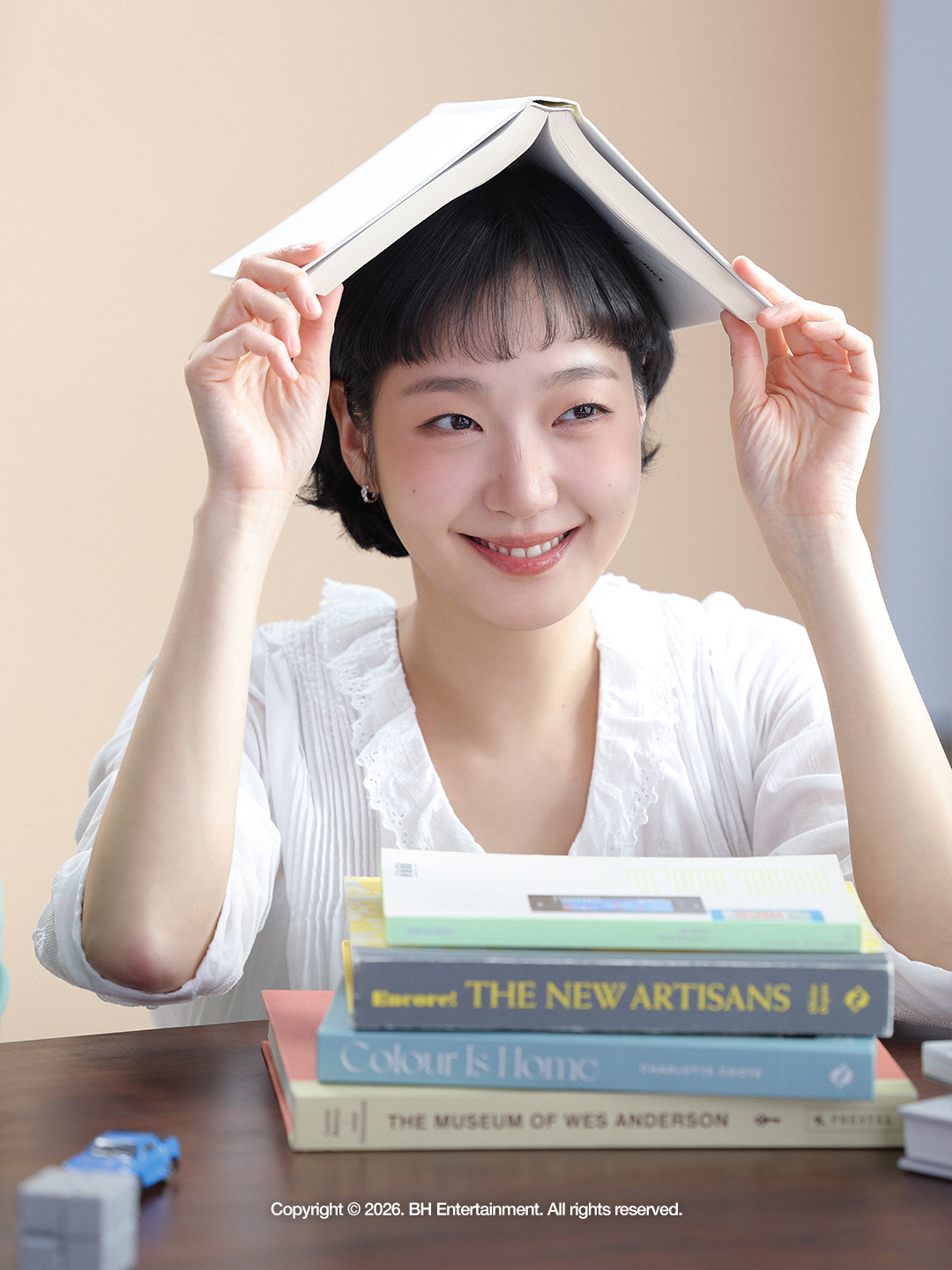 먼저, 부드러운 니트 스타일링으로 카메라 앞에 앉은 그는 눈을 반짝이며 환하게 웃고 있는 모습으로 보는 이들까지 미소 짓게 만든다. 이어진 컷에서는 세트 사이로 얼굴을 빼꼼 내밀거나 손으로 브이 포즈를 취하는 등 장난기 어린 표정으로 현장의 유쾌한 분위기를 전한다. 또 다른 컷에서는 책을 머리 위에 올린 채 장난스럽게 포즈를 취하며 사랑스럽고 내추럴한 매력을 발산, 촬영 콘셉트를 완벽하게 소화해 감탄을 자아낸다.