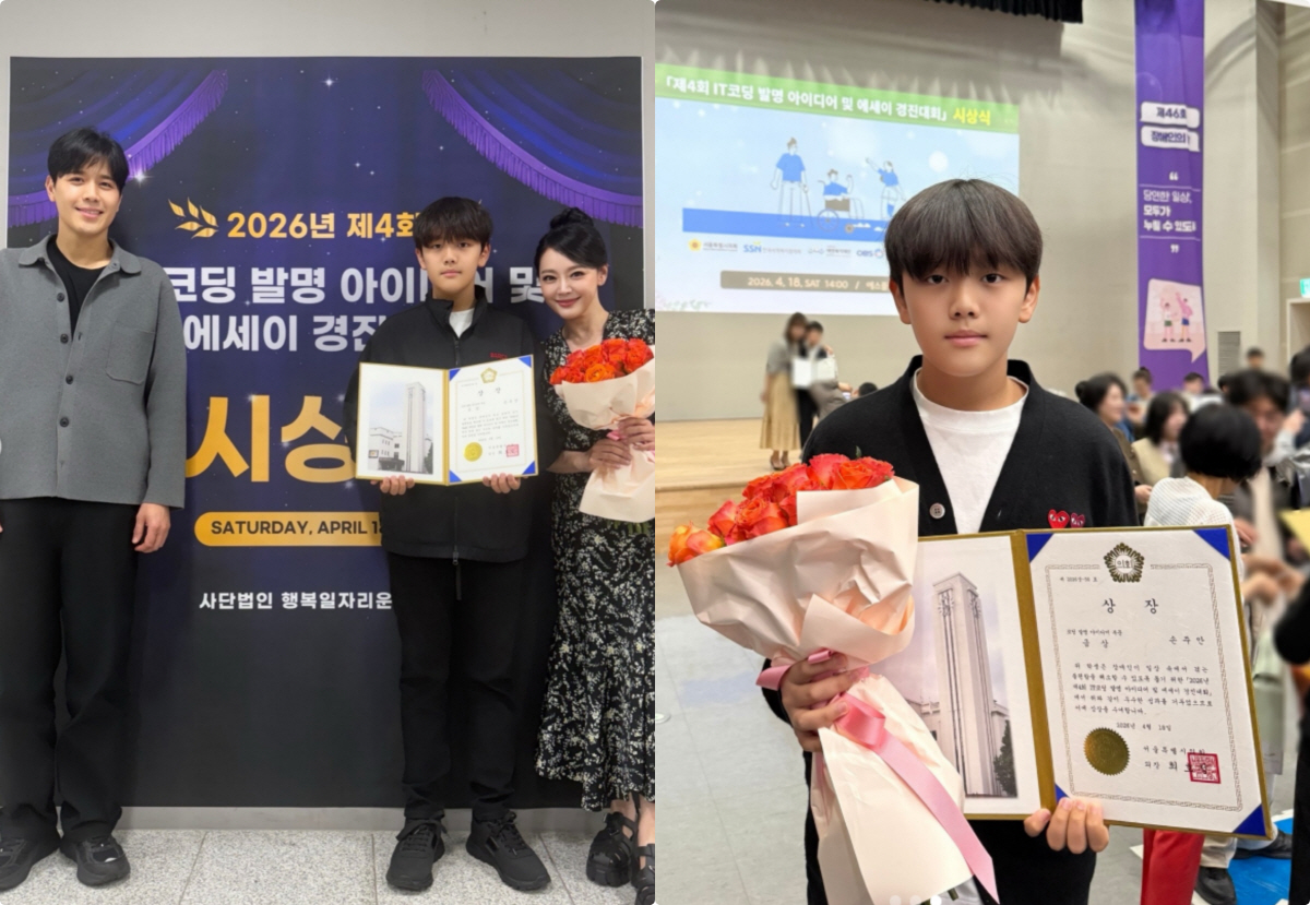 19일 김소현은 자신의 SNS를 통해 "IT 코딩 발명 아이디어 경진대회 #서울특별시의회 #금상 손주안 감사합니다"라는 글과 함께 여러 장의 사진을 공개했다. 공개된 사진 속에는 단정한 차림으로 시상식에 참석한 주안 군의 모습이 담겼다. 또렷한 표정으로 상장을 들고 있는 모습에서는 또래를 뛰어넘는 자신감과 성취감이 고스란히 전해졌다.