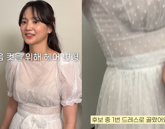 윤승아는 후보 드레스 중 1번을 선택해 아름다운 미모를 뽐냈다. 가녀린 허리라인에도 "방금 밥을 많이 먹었다"고 말해 웃음을 자아냈다. 앞서 그는 "결혼 당시 43kg였는데 지금은 50kg 가까이 된다"며 솔직한 체중 고백으로 눈길을 끌었다.