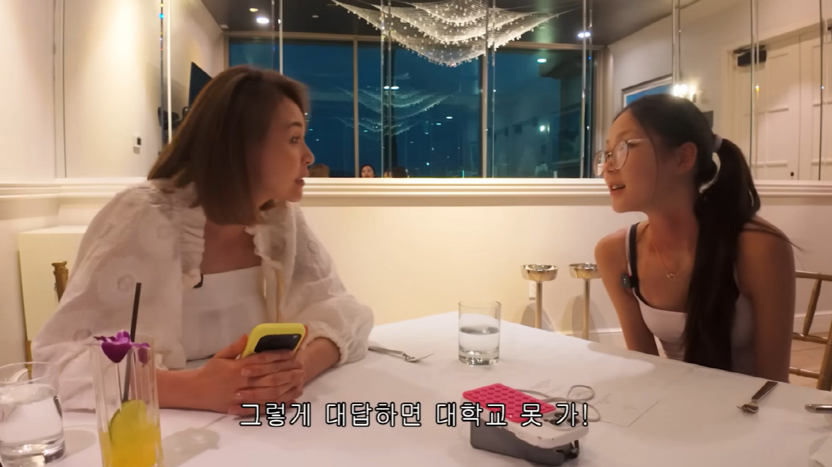 그러자 야노시호는 "그렇게 대답하면 대학교 떨어질 거다"라면서 잔소리를 시작했다. 이에 사랑 양은 눈을 꼭 감아 웃음을 안겼다. 야노시호는 여기서 그치지 않고 딸의 말을 그대로 따라 하며 장난스럽게 놀리는 모습을 보여 또 한 번 현장을 웃음바다로 만들었다.