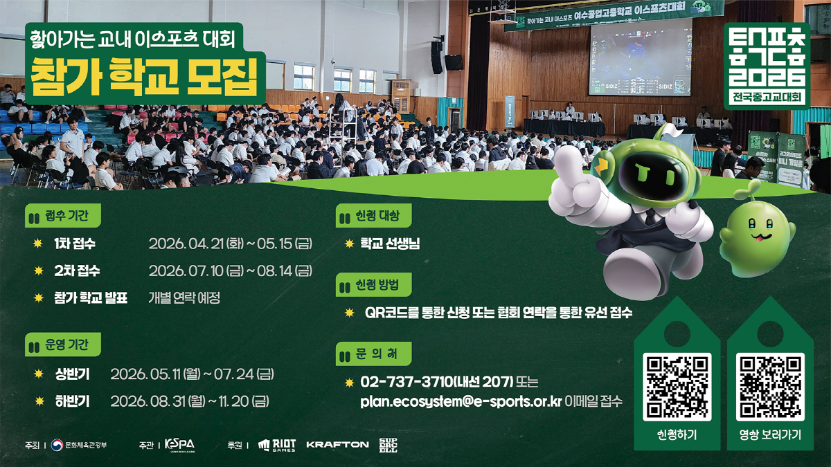2026년 학교 이스포츠 사업은 전국중고교대회, 클럽 강사 지원사업, 찾아가는 교내 이스포츠 대회 등 크게 3개 프로그램으로 구성된다. 이 가운데 전국중고교대회는 생활체육 참여 확대를 위한 '오픈서킷'과 전문 선수 육성을 위한 '스쿨리그'로 나뉜다.