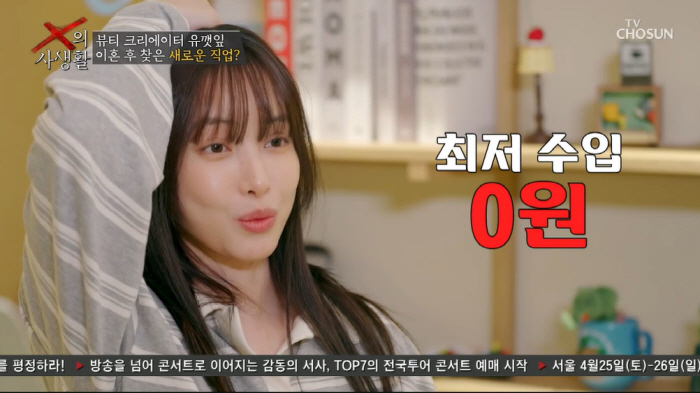 뷰티 크리에이터인 유깻잎은 한 달 최고 수입이 7천만 원이라고. 하지만 유깻잎은 카페에서 알바하며 수입을 충당하고 있었다. 유깻잎은 "크리에이터라는 직업이 프리랜서다 보니 고정 수입이 없다"며 "크리에이터 수입은 달마다 너무 다르다. 최저 수입은 0원이다. 양육비도 지급해야 해서 고정적 수입이 필요하다 생각이 들어서 알바를 하게 됐다. 이혼하고 나서 카페 일을 시작했다"고 밝혔다.